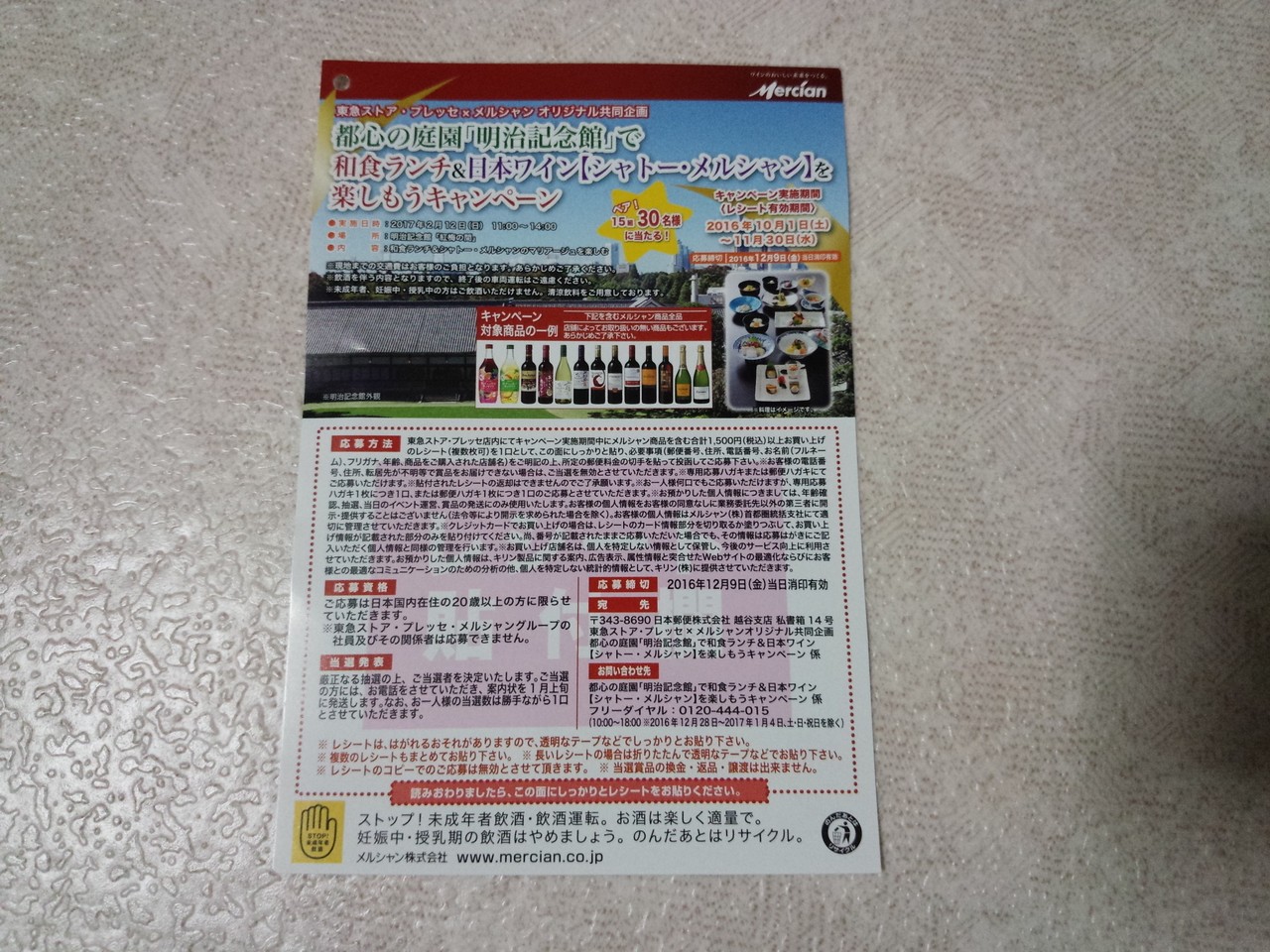 東急ストア プレッセ メルシャン 都心の庭園 明治記念館 で和食ランチ 日本ワイン シャトー メルシャン を楽しもうキャンペーン 〆切 16年12月9日 金 当日消印有効 まいにち更新 懸賞情報